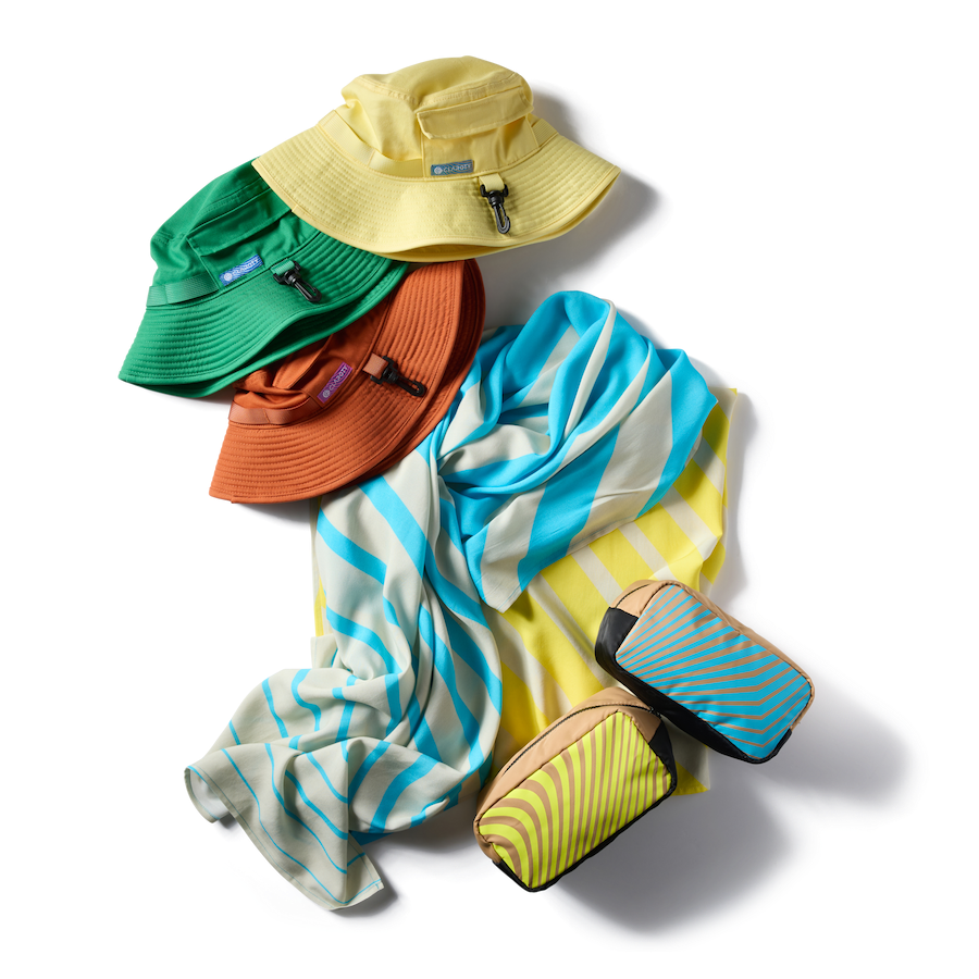 The kit includes a bold 3 color boonie hat, two soft patterned towels, and a pair of eye catching toiletry bags. Perfect for sunny days and stylish getaways.