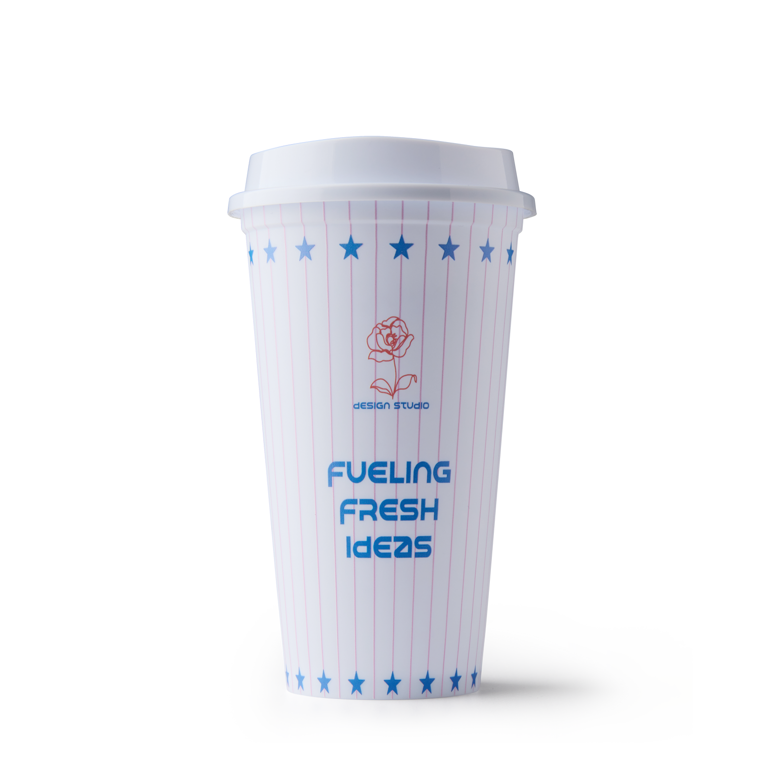 A playful, retro inspired mug designed to fuel your day with style. With its vertical pinstripes, star border, and bold red emblem, it’s perfect for hot drinks on the go. Lightweight, reusable, and ready for creative sips.